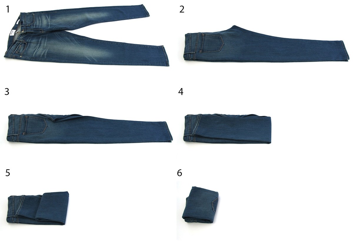 - Джинсы. Эта одежда занимает в шкафу катастрофически много места! Причем, найти при этом нужные джинсы, особенно, если их 10-12 пар, практически невозможно. Сложить джинсы компактно нам снова поможет метод «рулона»: складываем джинсы пополам и скатываем в тугой рулон. Таким образом, джинсы не мнутся и занимают меньше места. Джинсовые рулончики складываем в высокую коробку или раскладываем на полке так, чтобы была видна «сердцевина» каждого.
