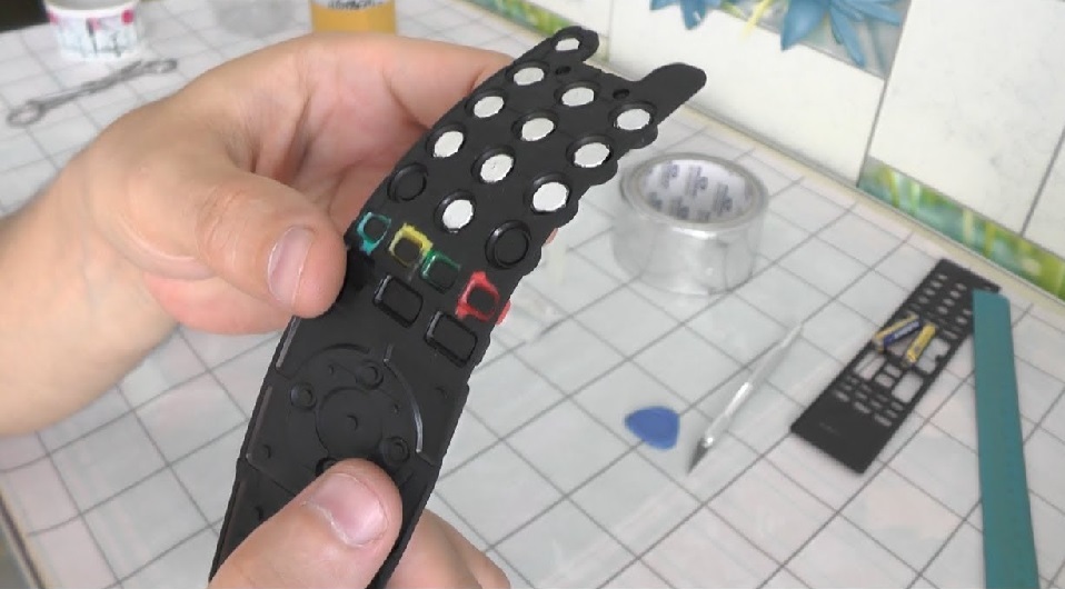 Проводится разборка прибора и извлекается резиновая часть. На оборотной части кнопок фольга, бумагой к кнопкам. В магазинах продаются комплекты, предназначенные для такого вида поломки. В комплект входит: клей и кнопки с напылением. Для ремонта достаточно будет наклеить поверх старых, новые кнопки.