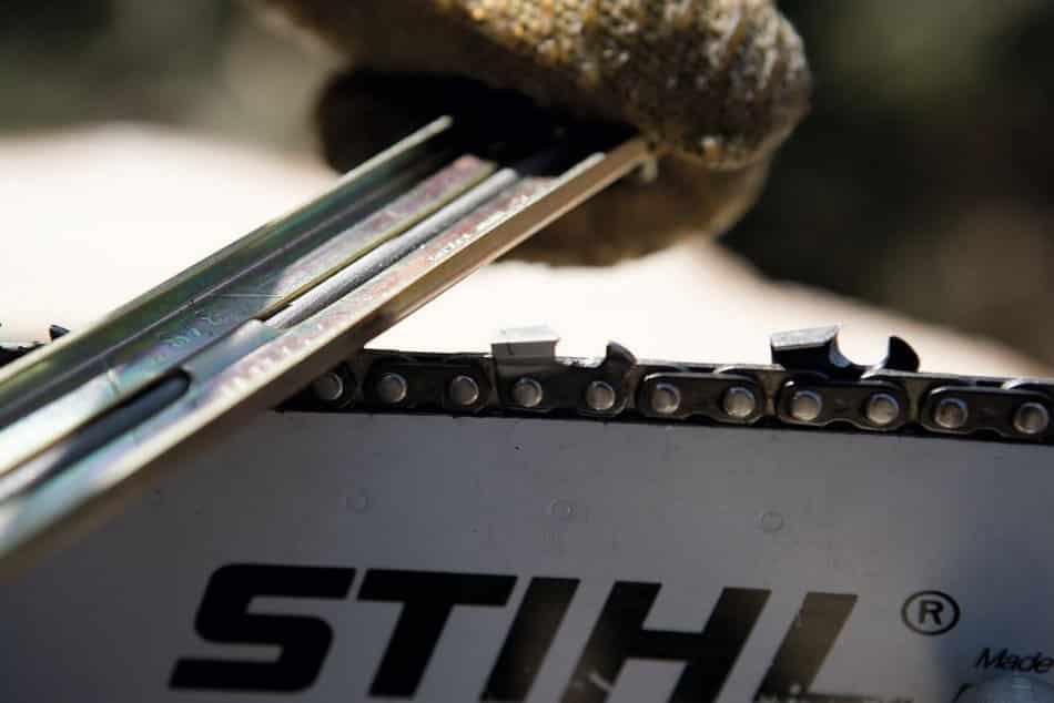 Ценится данный способ за возможность выполнения работы в любых, даже полевых, условиях, простоту процедуры и отсутствие необходимости использования дорогостоящего инструмента. Правильно заточить цепь бензопилы напильником поможет инструмент исключительно круглого сечения. Для определения параметров напильника нужно знать размеры самой пилы, в частности требуется определения шага расположения зубьев. Для обработки ограничителя глубины пиления направляющего зуба допускается использование плоской вариации.