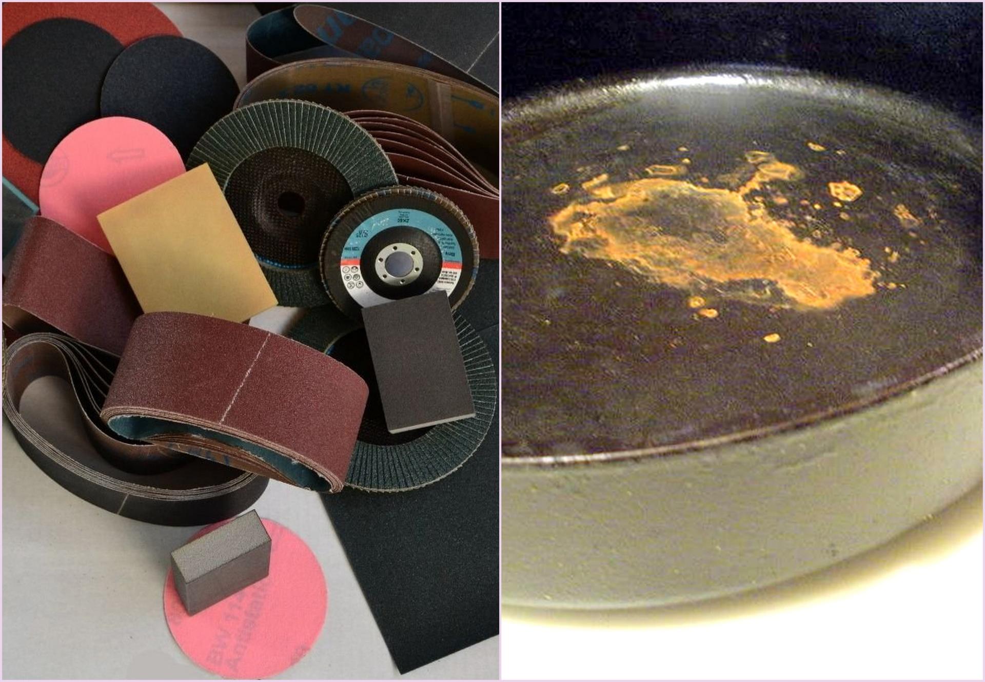 Чем очистить налет? Существует довольно-таки очевидный способ, как можно убрать ржавчину с чугунной сковородки. С непростой задачей справится обычная наждачная бумага. При толстом слое стоит использовать бумагу 5 размера. Активно трите места загрязнений, затем возьмите наждачку с меньшей зернистостью, продолжите чистку.