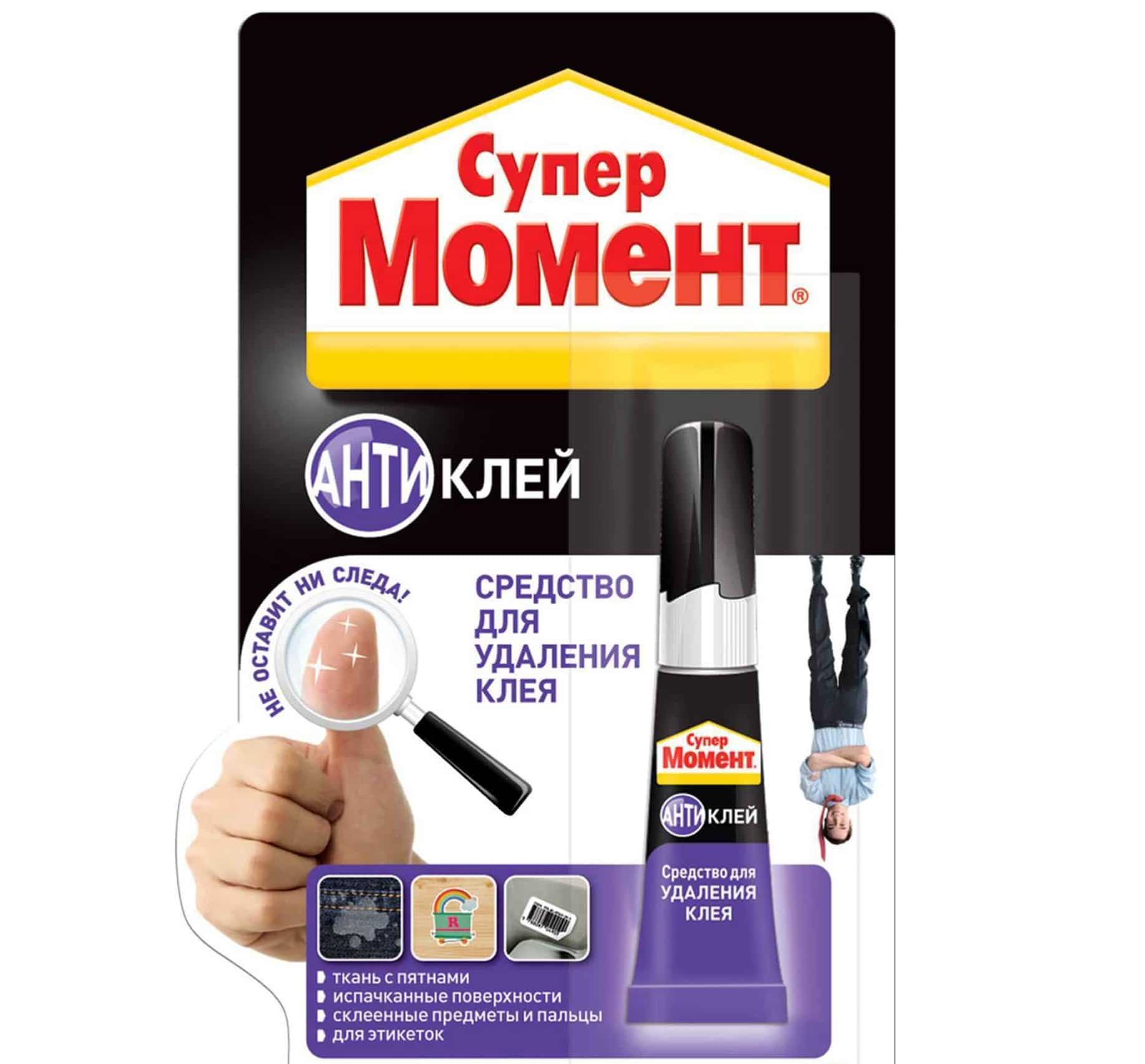 В хозяйственных магазинах продается «Антиклей», упаковка которого похожа на тюбик «Момента». Это средство быстро удаляет следы от суперклея не только с кожи, но и с других поверхностей, в том числе с одежды. «Антиклей» подойдет для ребенка, замаравшегося клеем, так как состав действует эффективно и безопасно.