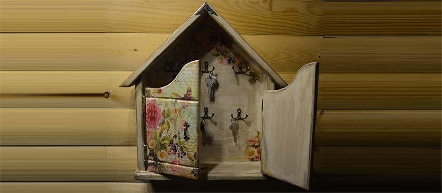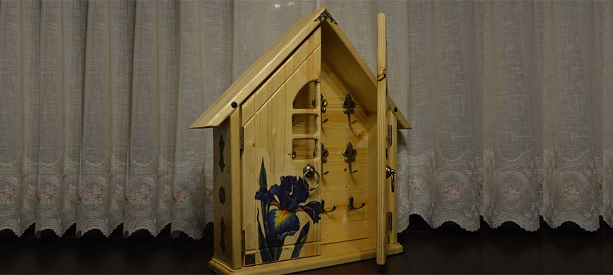 Данный вид изделия похож на домик или скворечник, у которого есть дверки. Такие ключницы изготавливают из дерева, пластика и текстиля. Но как показывает практика, многие предпочитают деревянный стиль. Для изготовления потребуются следующие материалы: