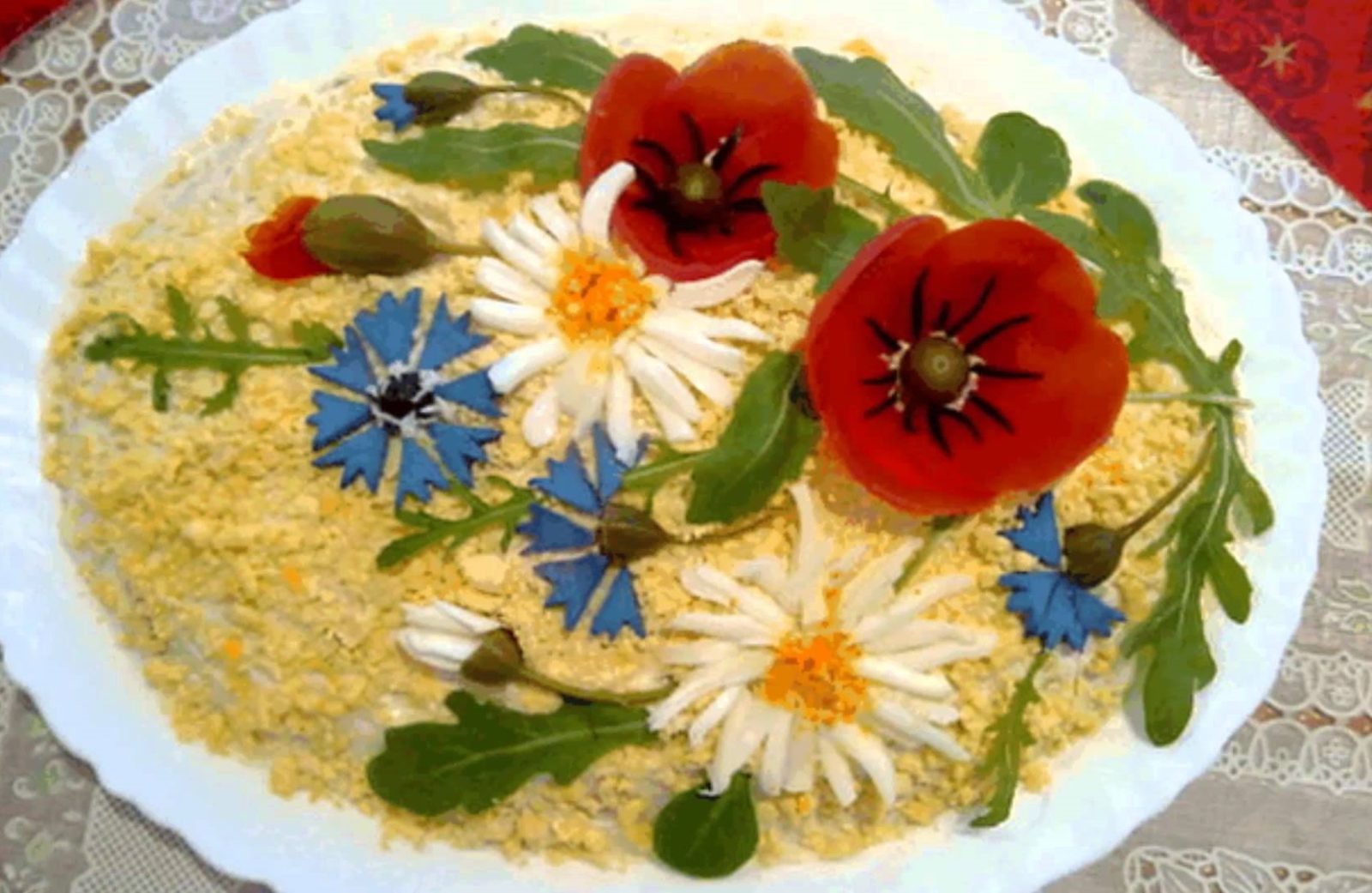 Салат будет выглядеть более празднично, если его украсить съедобным бутоном.