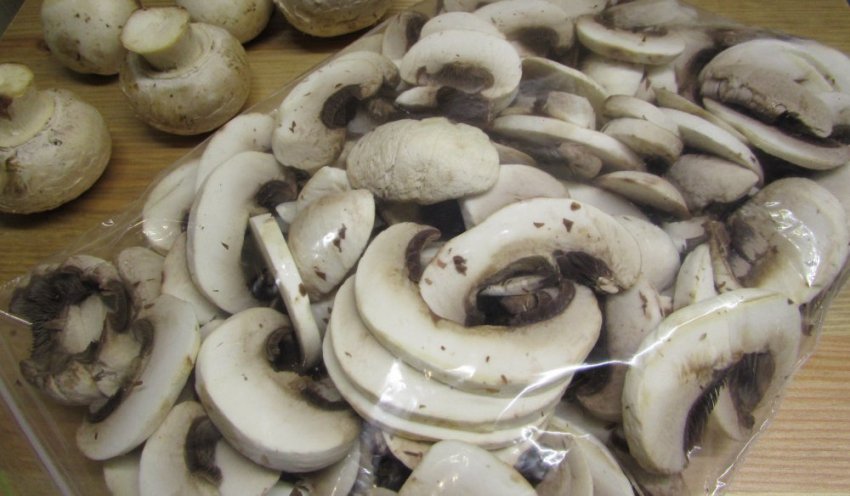 Сырые шампиньоны, как правило, замораживают для запекания в качестве главного ингредиента. Хозяйки, которые планируют использовать грибные заготовки для приготовления супов, запеканок и основных блюд, часто хранят продукт нарезанным аккуратными слайсами или кубиками.