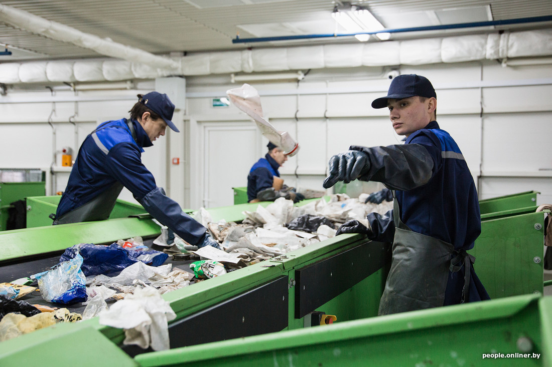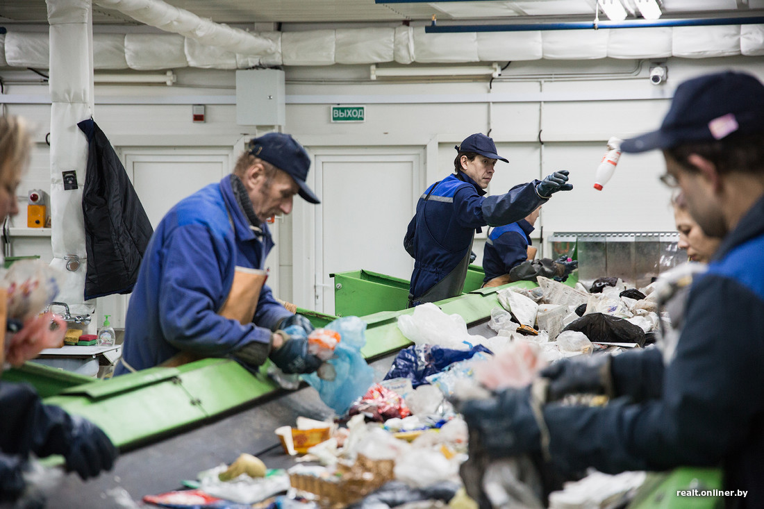 Оставшийся мусор подается на транспортерные ленты для дальнейшей ручной сортировки. На каждой из трех линий работают по 14 человек. Кто-то выхватывает с движущейся ленты картон и бумагу, кто-то — пакеты и пленку, алюминиевые банки из-под напитков. Цветные и прозрачные бутылки собираются отдельно.