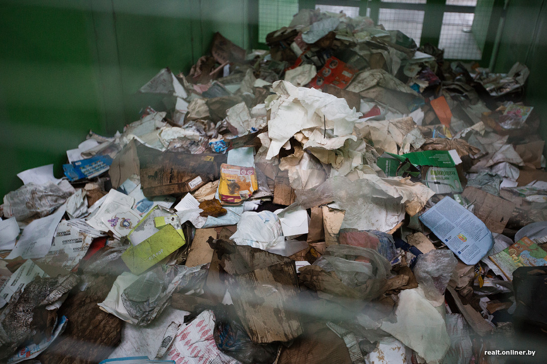 На крытой площадке только что разгрузились два мусоровоза. Один собирал отходы из обычных контейнеров — все, что прилетело из мусоропроводов. Второй опустошал контейнеры с пластиком, макулатурой и стеклом. Визуально две горы различаются мало.