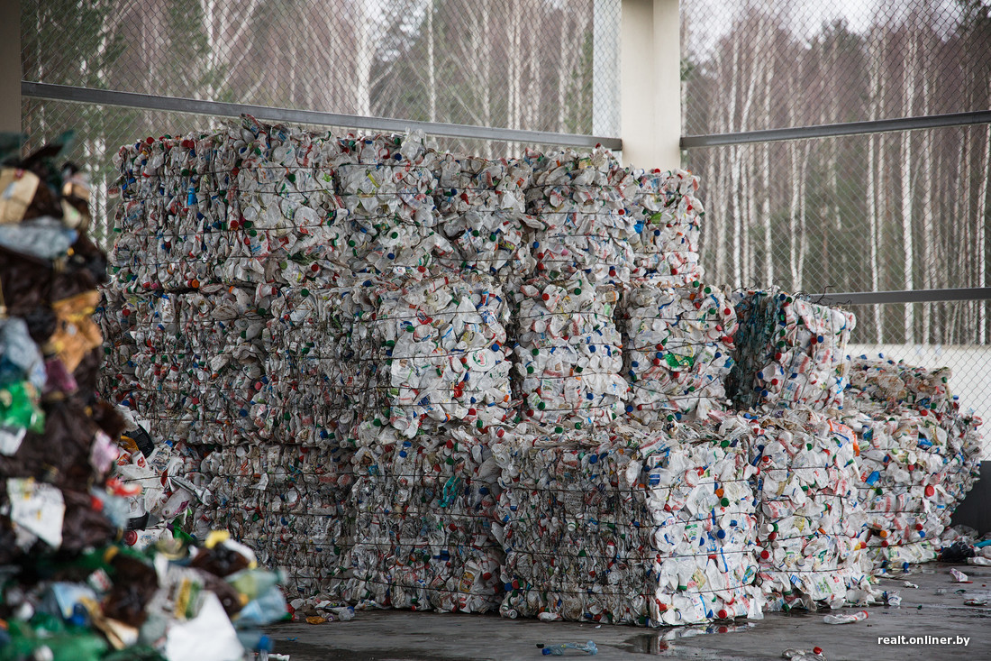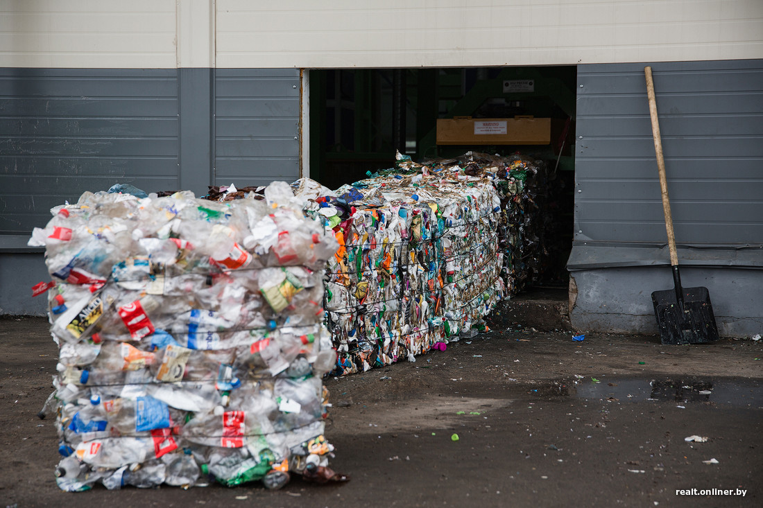 Спрессованные тюки бутылок и пакетов отвозят на склад, где они дожидаются отправки на предприятия для переработки.