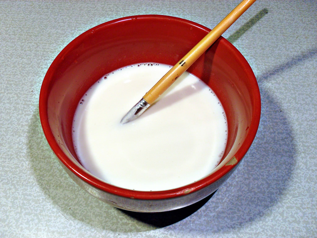 Без труда в домашних условиях можно приготовить казеиновый клей. Для этого понадобятся ингредиенты: казеин и вода в соотношении 2 к 1. В специальную емкость высыпать сначала казеин, после чего тонкой струйкой добавлять воду, постоянно помешивая для создания однородной клеевой массы. Эта смесь также быстро застывает, и после этого уже не может быть использована.