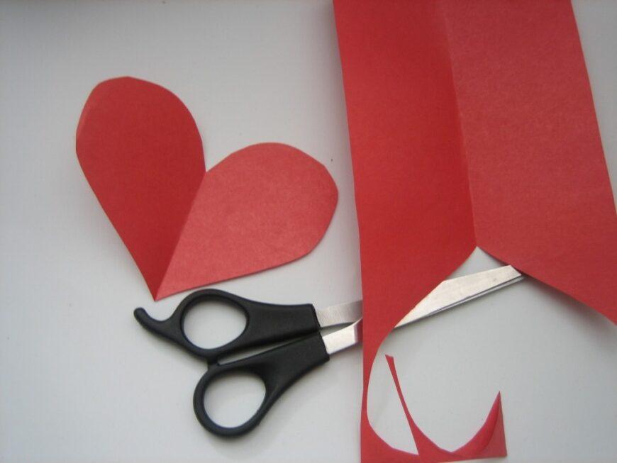 Картон красного цвета складывается пополам по горизонтали таким образом, чтобы изнаночная сторона была снаружи. На одной части картона рисуется половина сердечка. Ножницами заготовка вырезается.
