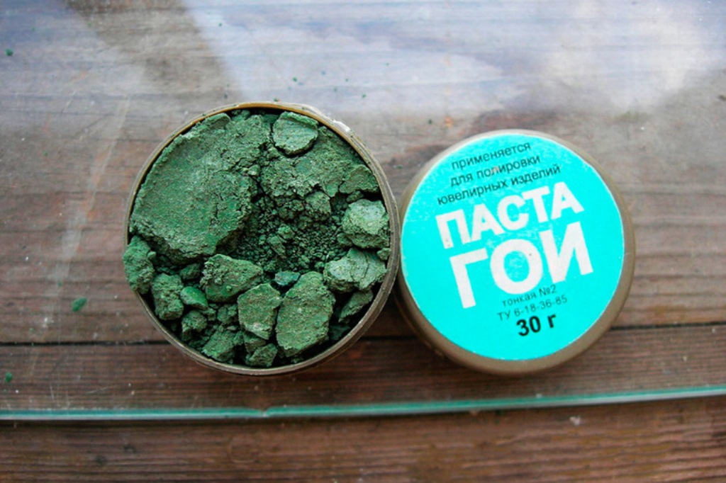 Важно! Самым распространенным считается состав пасты ГОИ № 2. Она идеально подойдет для изделий из драгоценных и цветных металлов, а также стекол и пластмассы