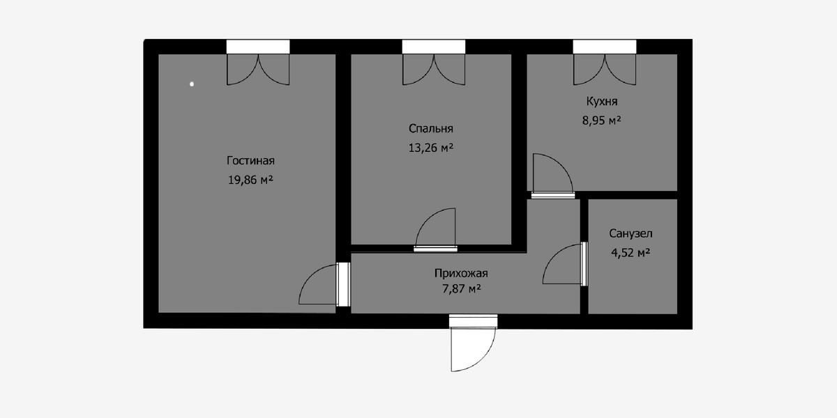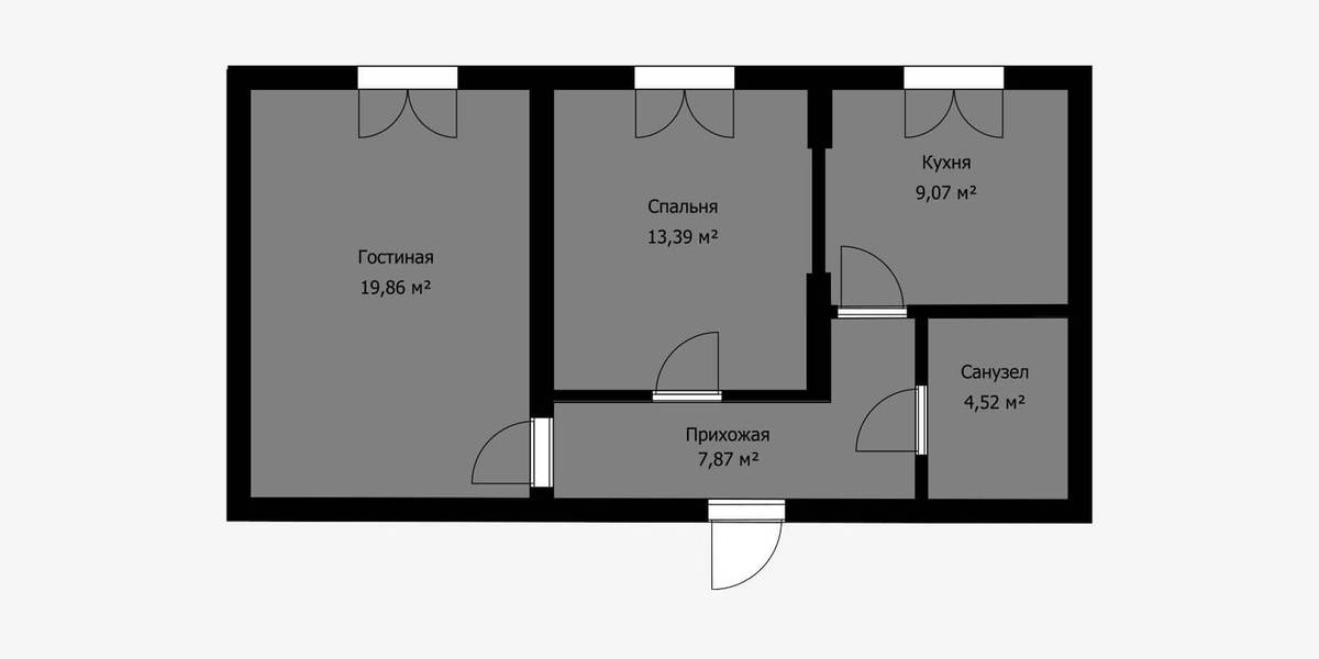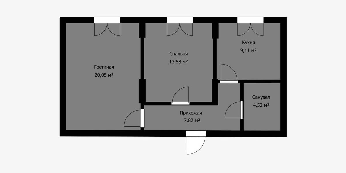 Но иногда в стене между комнатой и кухней предусмотрен дверной проем. На плане его можно отличить по небольшому участку тонкой стены