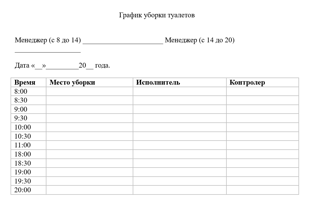 Скачать график и сопутствующие образцы туалета : Классический вариант графика помещений с менеджером-контролером.