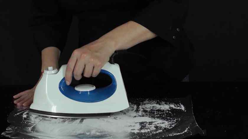 - Нагреть утюг и, плотно прижимая, провести по листу. Соль поглотит все загрязнения с поверхности подошвы.
