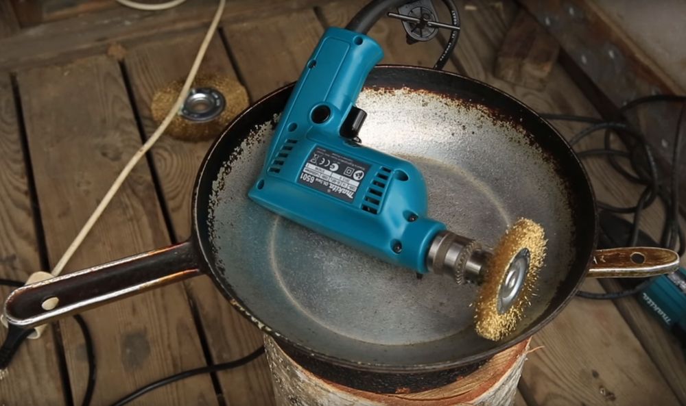 Для очистки нагара следует приобрести в строительном магазине специальные насадки на электрическую дрель или шлиф машинку (болгарку.) Лучше выбирать именно металлические насадки, так как насадки из шлифовальной бумаги будут забиваться жировыми отложениями и их эффективность снизится. Для чистки лучше всего сначала использовать металлическую щетку для уборки основного нагара, а затем щетку на основе мелкозернистой шлифовальной бумаги для удаления мелких царапин, которые неизбежно оставить металлическая щетка. Этот метод тоже нельзя применять для сковородок с различными специальными антипригарными покрытиями.