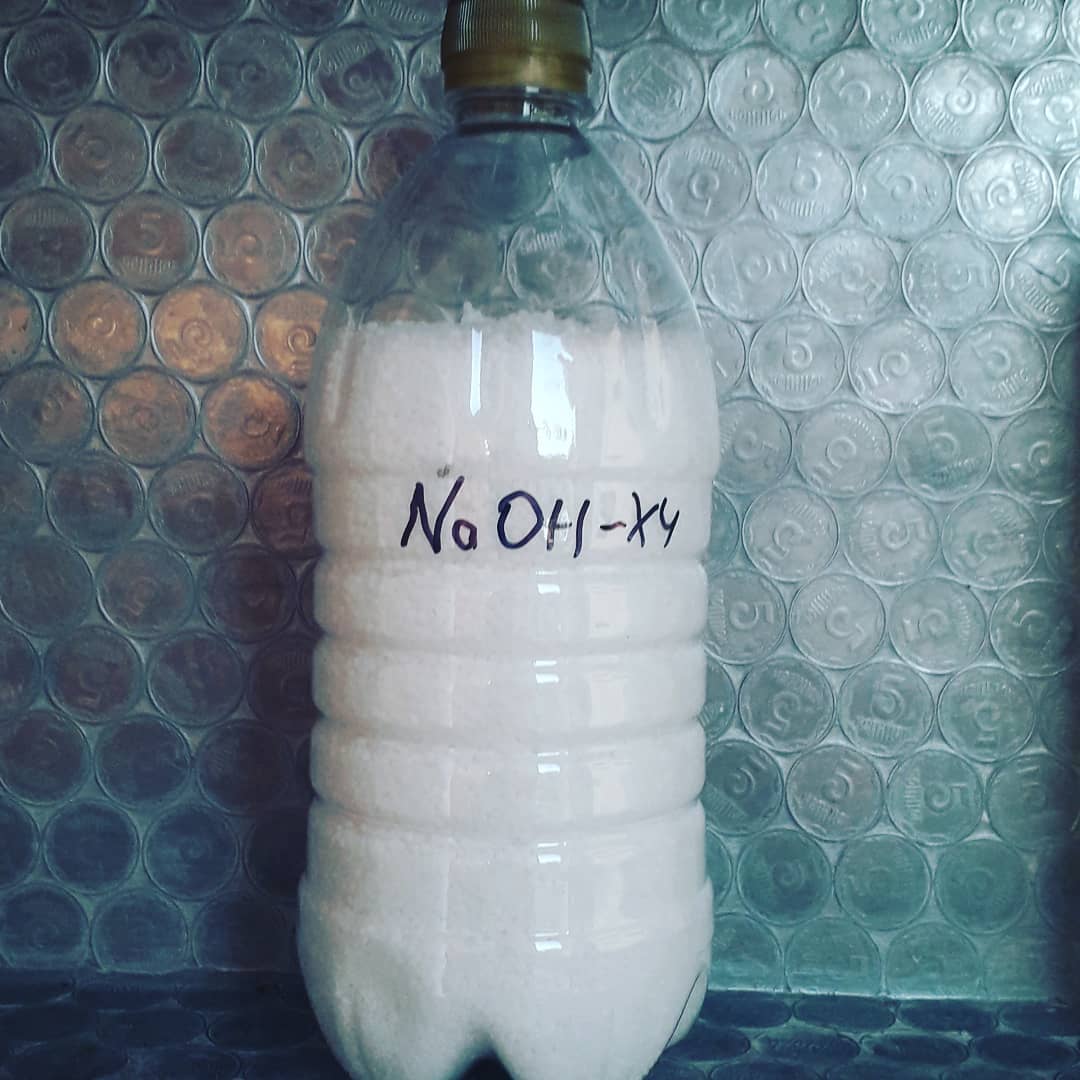 - Готовят смесь из 4 л холодной воды и 200 г едкого натра.