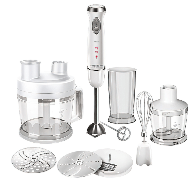 Рейтинг блендеров с нарезкой кубиками откроет продвинутый прибор мощностью 1300 Вт, оснащенный внушительным количеством насадок и чаш для решения практически любых задач на кухне. Корпус и элементы крепления насадок изготовлены из высокопрочного пластика, выдерживающего значительные нагрузки. При этом сама погружная часть металлическая, так что беспокоиться за сохранность прибора даже при высоких нагрузках не придется. Предусматривается механическое управление и функция плавной регулировки скорости для комфортной работы.