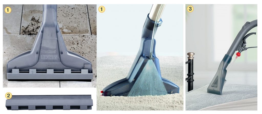 Распыление чистой воды происходит с помощью трубки (капилляра), которая закреплена у основания насадки. На самой насадке есть специальное узкое отверстие — сопло, с его помощью всасывается вода и грязь. Некоторые модели моющих пылесосов оснащены дополнительным фильтром, который способен задерживать крупный мусор.