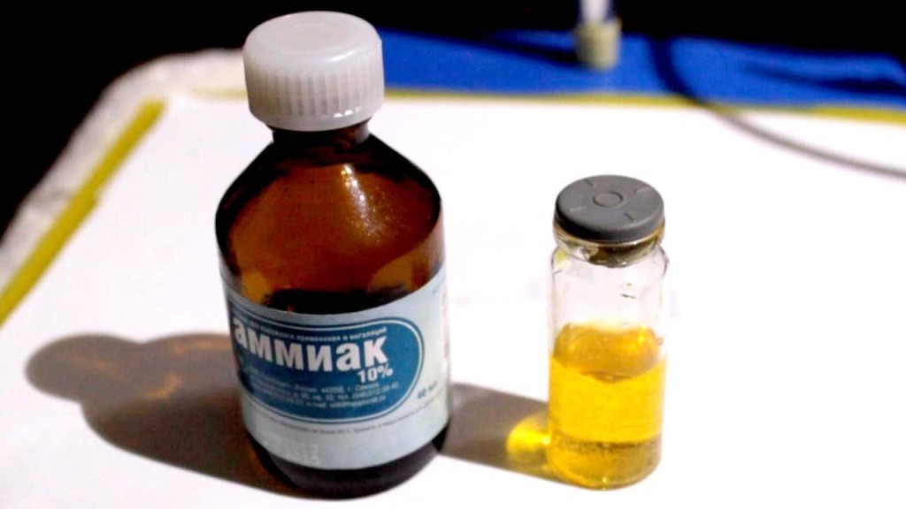 - Смешайте в стакане тёплой воды чайную ложку аммиака (нашатырного спирта), три чайные ложки перекиси водорода, щепотку стирального порошка.