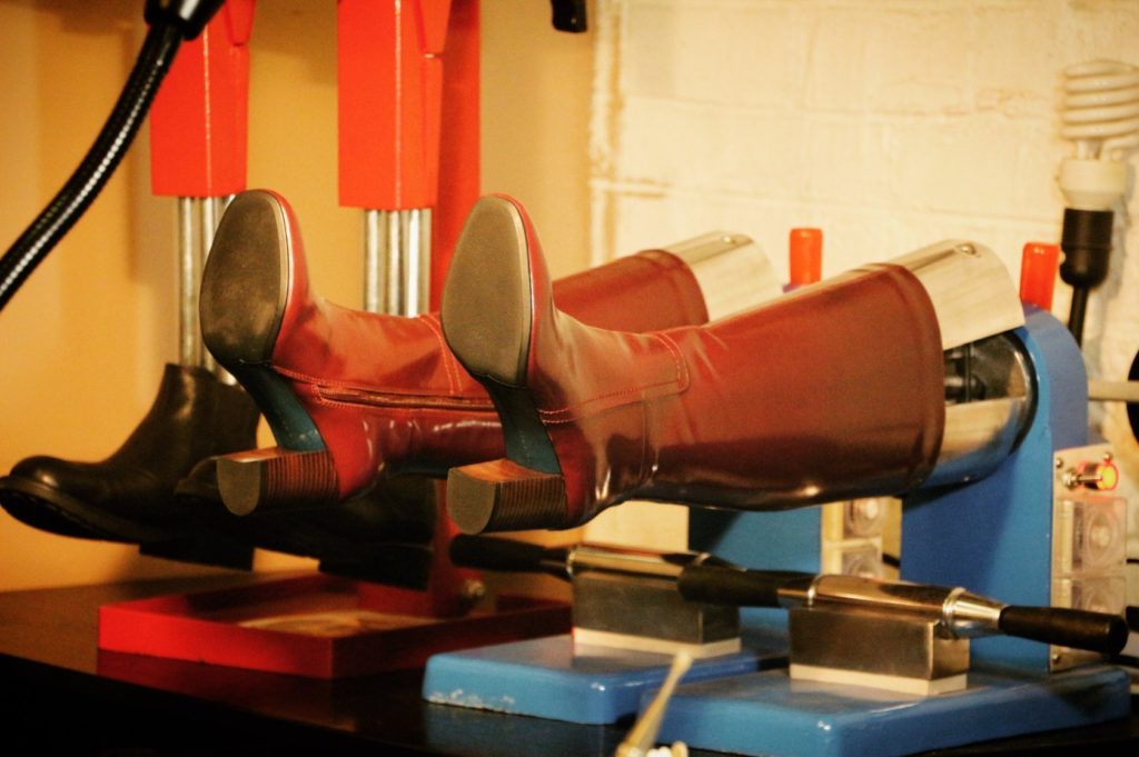 - Мастера используют специальные металлические колодки с подогревом – на них надевают обувь и постепенно растягивают до нужного размера под воздействием высоких температур.