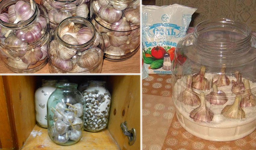 - В банках. Чеснок выкладывается в стерилизованные банки и засыпается солью.