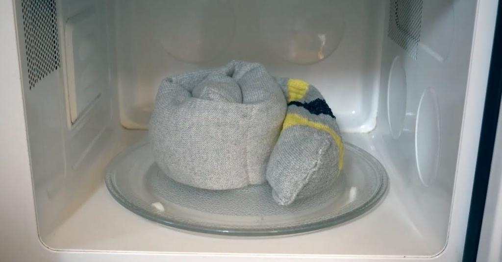 После этого засыпанные рисом носки нужно положить в микроволновую печь на 2-3 минуты. Этого времени достаточно, чтобы они успели сильно нагреться. Затем приложите теплые носки к посуде с едой