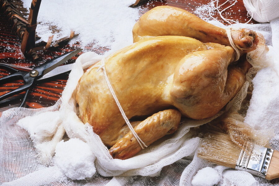 - Маринадом тушку птицы покрывают изнутри и снаружи. Затем утку или гуся оставляют на несколько часов на открытом воздухе, чтобы кожа подсохла и сморщилась. Благодаря этому на последнем этапе запекания птицы она быстро подрумянится, сохранив сок внутри.