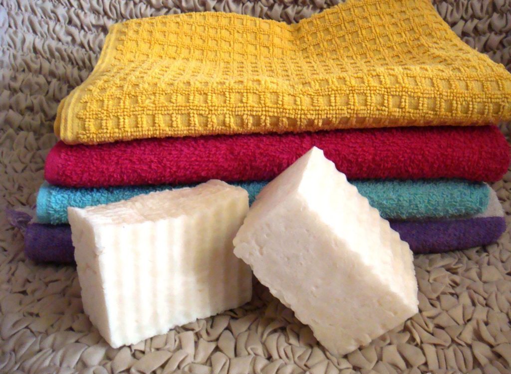 - Загрязненное кухонное полотенце можно замочить в «крепком» мыльном растворе на 1-2 часа с последующей стиркой. Для этого хозяйственное мыло трут на терке и заливают теплой водой.