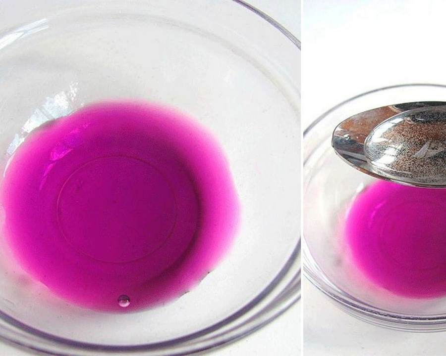 Важно не переборщить с марганцовкой, чтобы не испортить материал. Если раствор получился насыщенный, добавляют воду, пока цвет не станет светло-розовым