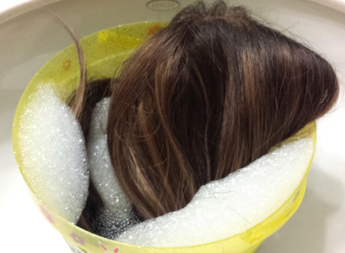 Если видно, что волосы выглядят хуже, прическа не пышная, парик нужно мыть. Воду берут мягкую (кипяченую, с добавлением соды 2 ч.л на 1 л), шампунь и кондиционер специально разработанный для париков. Перед мытьем искусственные волосы расчесать.