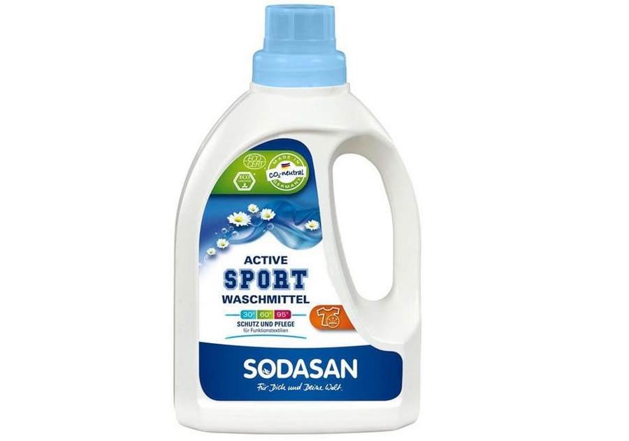 - SODASAN Acyive Sport. Гель для высококачественных спортивных вещей. Производитель – Германия. Сделан для обработки лыжных костюмов и другой одежды для активных видов спорта. Материал: микрофибра, мембрана (симпатекс, гортекс). Средство экологически чистое, с ним ткань не теряет свойств. Применяют даже для спортивной обуви. Используют для ручной и машинной стирки.